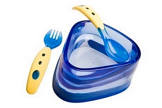 Less Mess Metal Spoon and Fork (9 Months & Up) Inspire Independence: This little spoon and fork looks like the ones Mommy and Daddy use! Curved metal spoon and “spork” bowls have tiny holes to help suction food in place to prevent spills on route from plate to mouth. The grips are textured and wide enough for little hands to hold in either right or left hand. The set comes in boy or girl colors with suggested retail price of $3.99 each.
